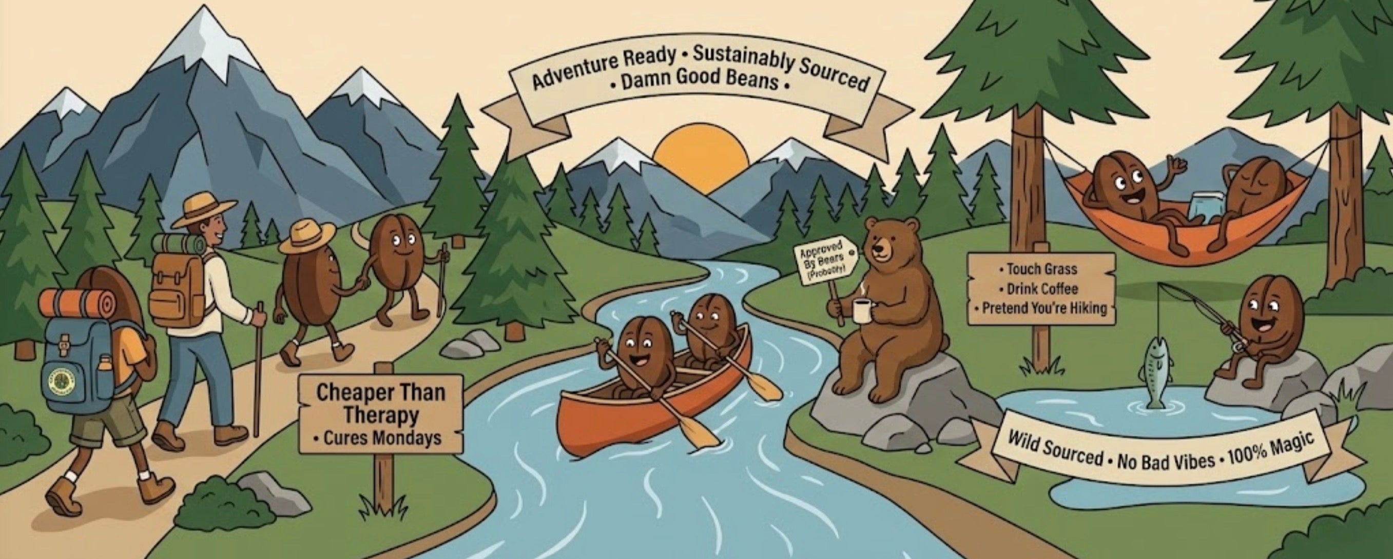 Cheaper Than Therapy • Cures Mondays • 100% Magic • Adventure Ready • Sustainably Sourced • Damn Good Beans • Touch Grass • Drink Coffee • Pretend You're Hiking • Approved By Bears (Probably) • Wild Sourced • No Bad Vibes •